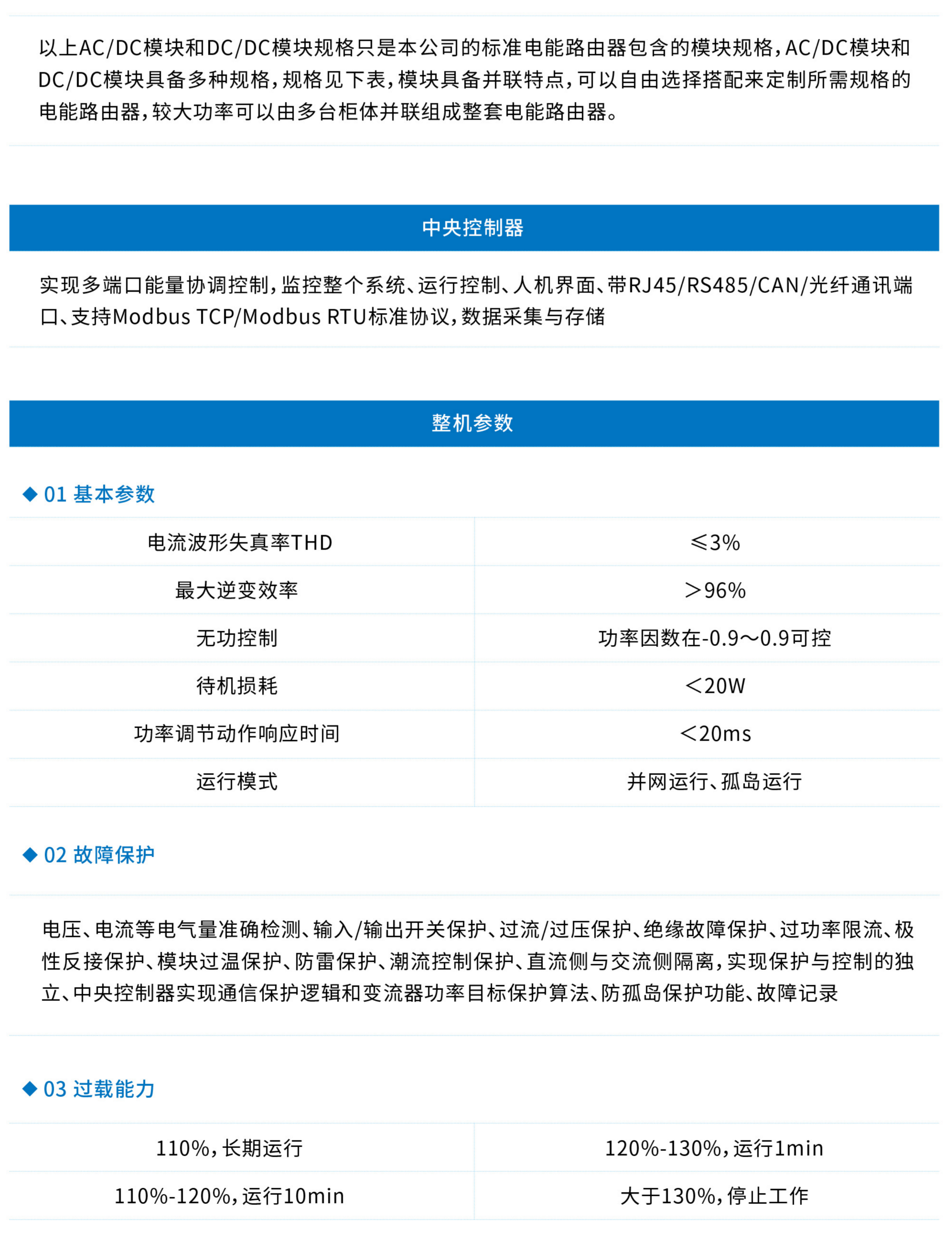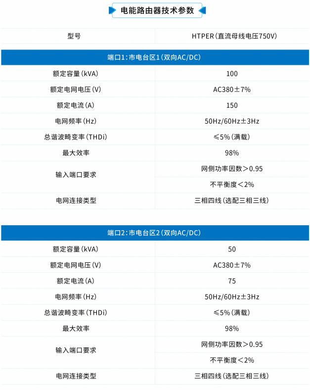 端口数量和大小可根据用户需求定制,较大功率的电能路由器采用多模块并联设计,由多台柜体组成整套电能路由器,功率范围扩大到400kW,单端口最大功率可达500kW。